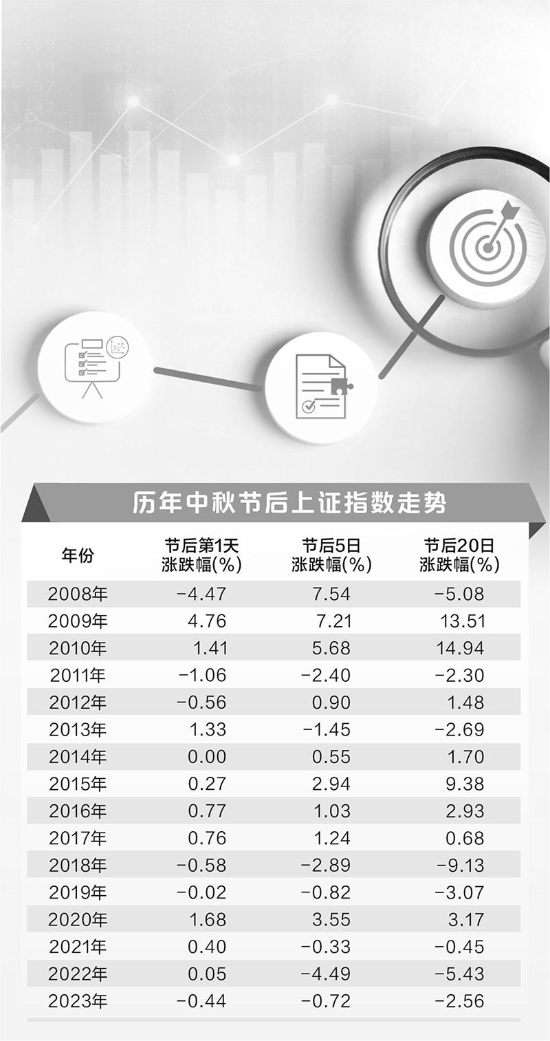 从历史数据来看,据证券时报·数据宝统计,2008年以来,A股在中秋节后的首个交易日上证指数上涨的次数有10次,上涨概率为62.5%;节后5个交易日内上证指数上涨的次数有9次,上涨概率为56.25%;节后20个交易日内上证指数上涨的次数有8次,上涨概率为50%。