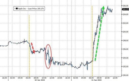 苹果股价盘中突破200美元大关,收涨近7.3%,创2022年11月10日以来最大涨幅,刷新2023年12月14日所创的收盘历史新高,自2021年11月30日以来首次领涨标普成分股,周二也在道指和纳斯达克(17608.4356264.891.53%)100指数从成分股中涨幅居首。